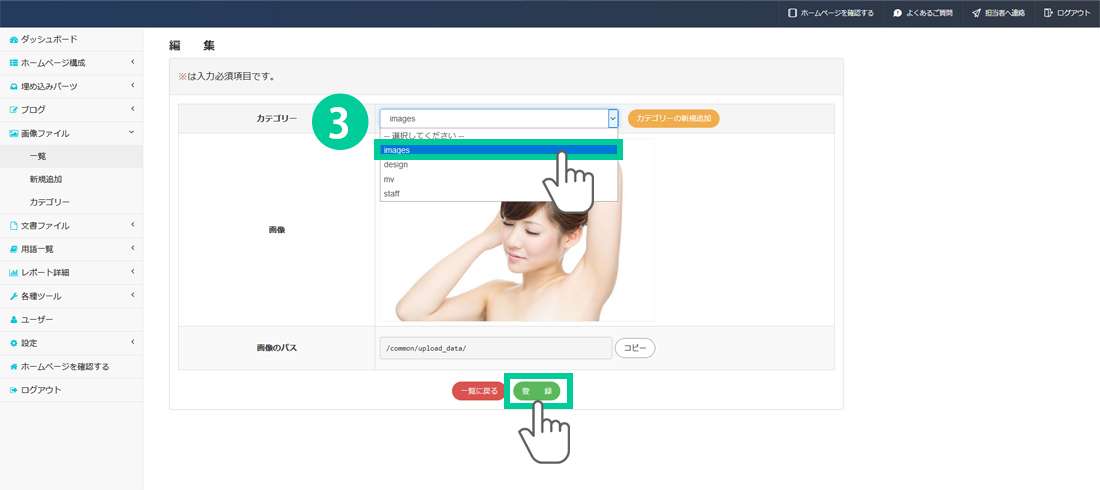 *振り分け先のカテゴリーは、予め登録しておく必要があります。画像のカテゴリーを編集・削除する方法はこちらのページからご確認ください。