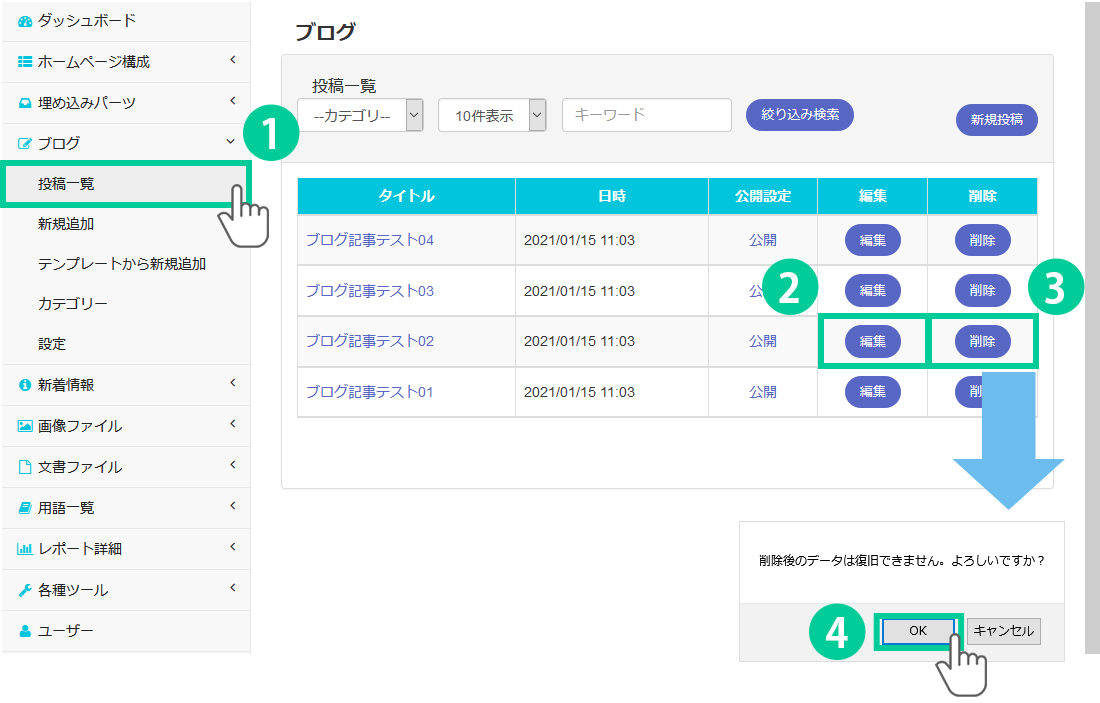 このページでは作成したブログ記事の編集と削除方法についてご説明します。