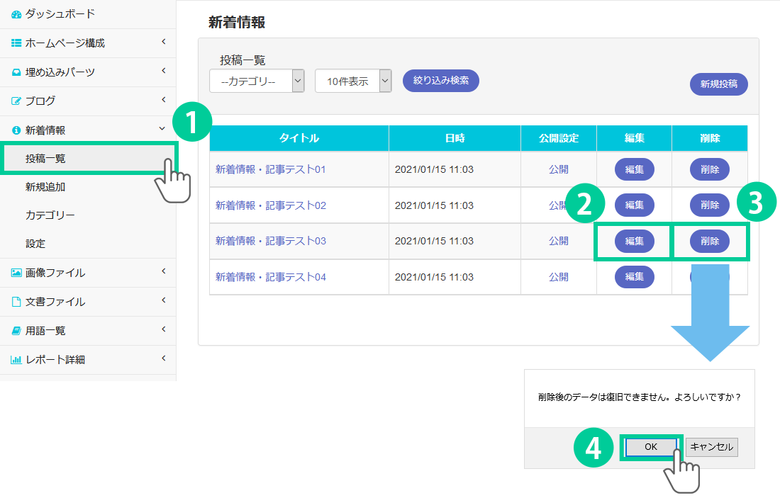 このページでは作成した新着情報記事の編集と削除方法についてご説明します。