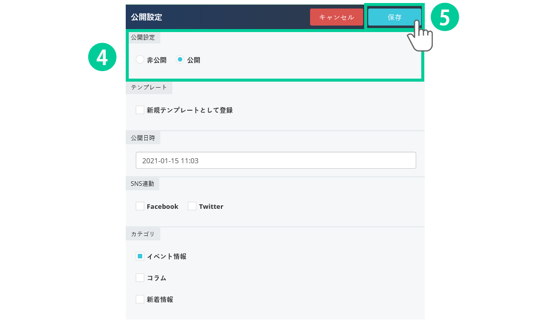 このページでは作成した新着情報記事の公開と非公開の方法についてご説明します。