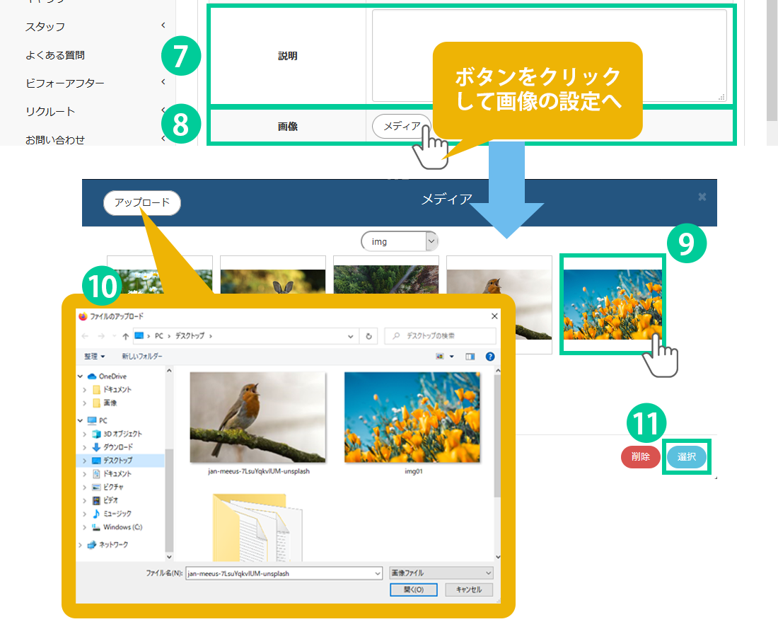 「アップロード」をクリック、画像を選択して「開く」ボタンを押すと、既に登録している画像の一覧に表示されます。後は⑧番と同様、表示させたい画像を選択します。