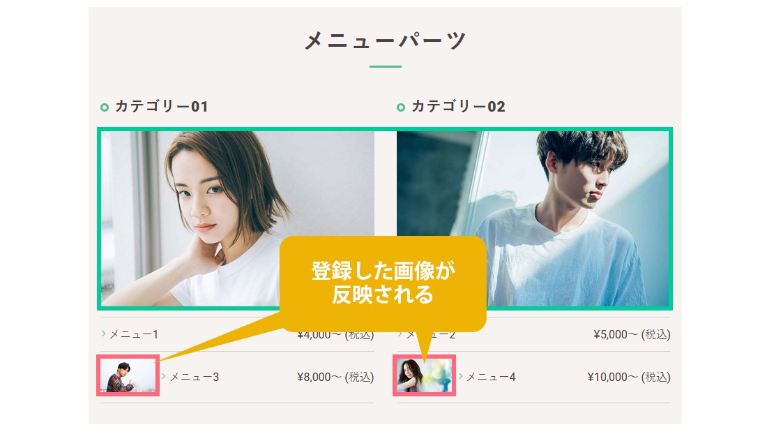 緑枠の写真はカテゴリー名に対して画像を設定します。詳細は「メニューのカテゴリーを追加する」ページで説明していますのでこちらからご確認ください。