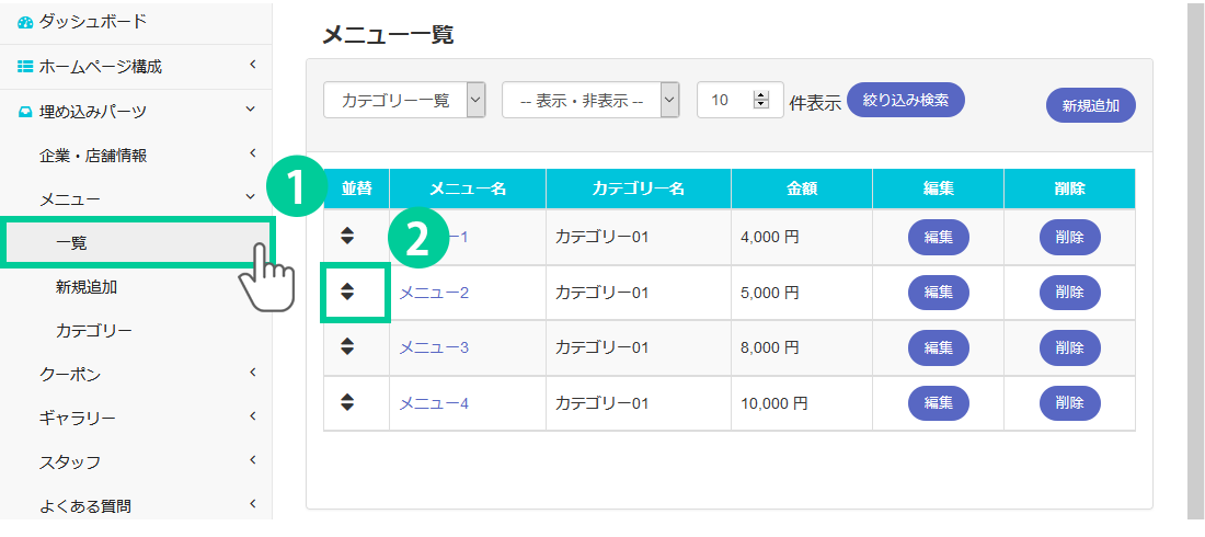 2.上下の矢印ボタンをドラッグ&ドロップすると、メニューの順番を入れ替えることが出来ます。