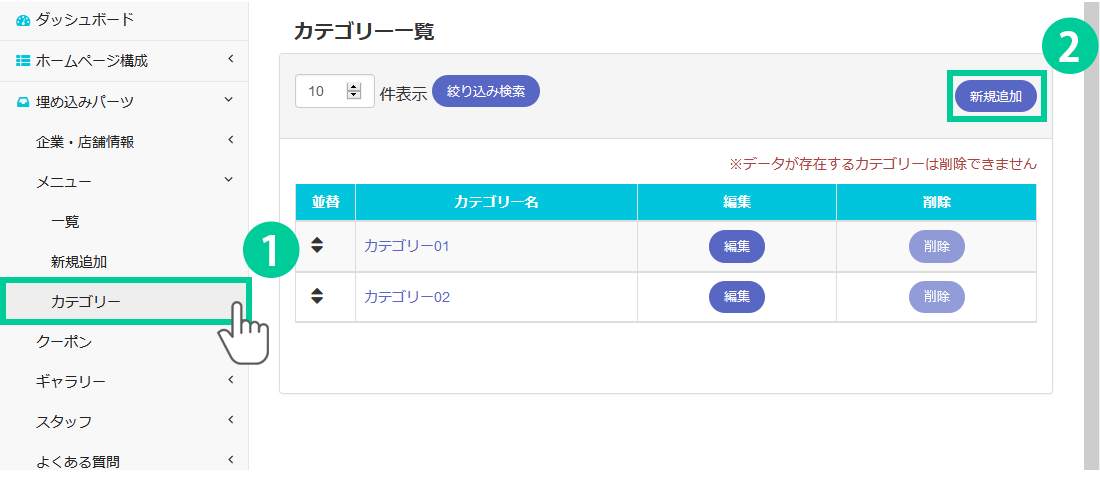 このページではメニューのカテゴリーを追加する方法についてご説明します。