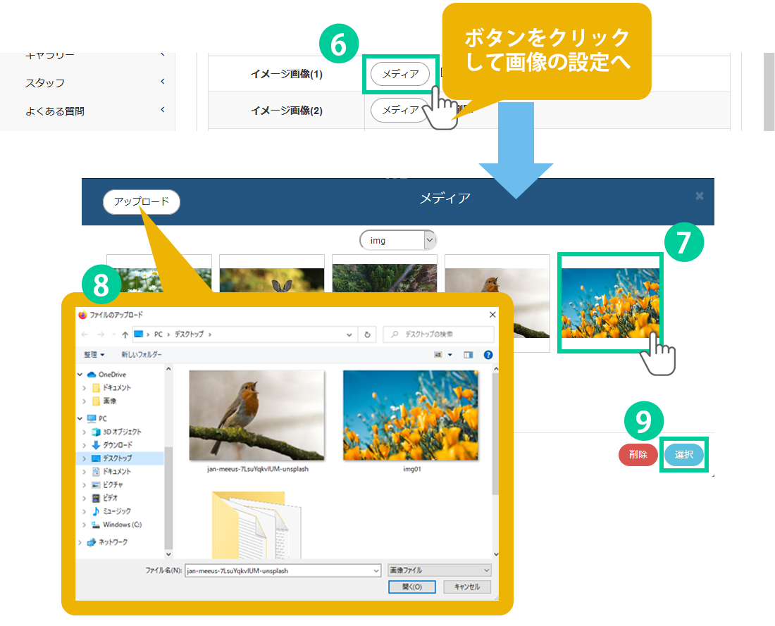 「アップロード」をクリック、画像を選択して「開く」ボタンを押すと、既に登録している画像の一覧に表示されます。後は⑧番と同様、表示させたい画像を選択します。