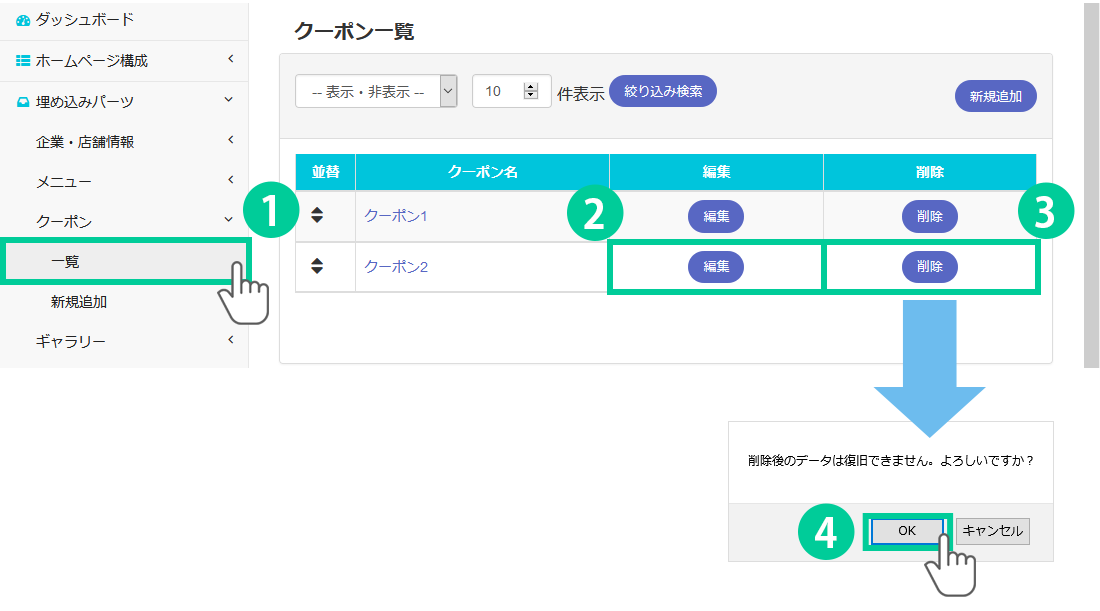 1.管理画面の左側にあるメニューから「埋め込みパーツ> クーポン> 一覧」をクリックします。