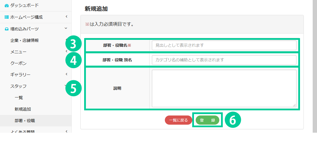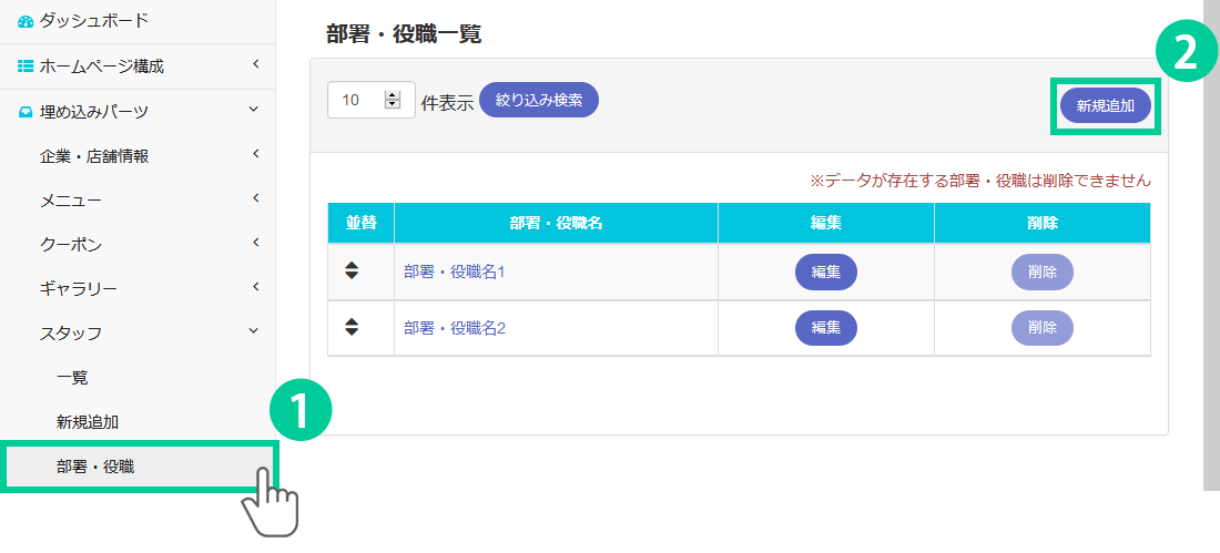 1.管理画面の左側にあるメニューから「埋め込みパーツ> スタッフ> 部署・役職」をクリックします。 2.「新規追加」ボタンをクリックします。