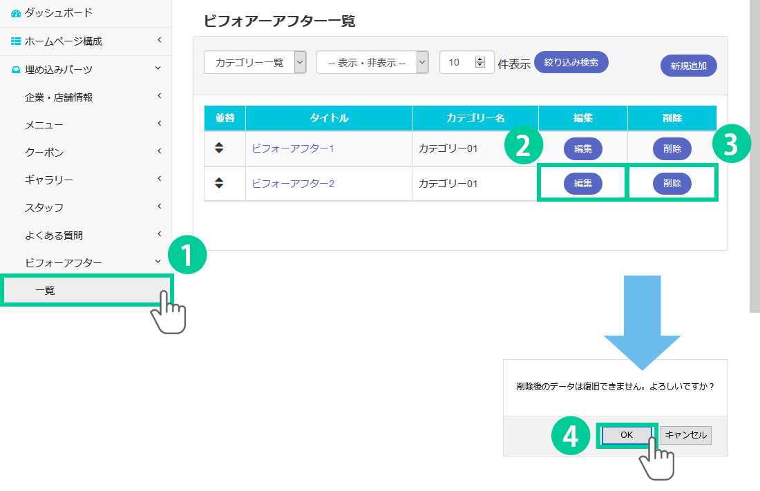 このページでは作成したビフォーアフターの編集と削除方法についてご説明します。