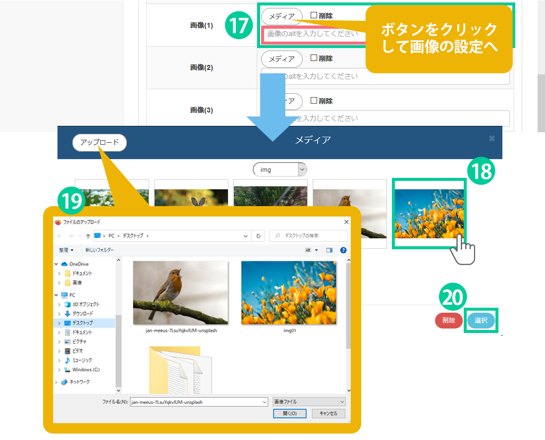 「アップロード」をクリック、画像を選択して「開く」ボタンを押すと、既に登録している画像の一覧に表示されます。後は⑱番と同様、表示させたい画像を選択します。