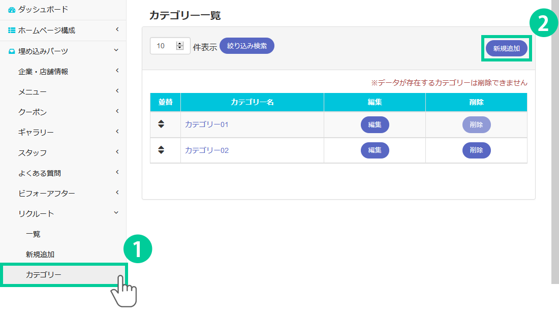 1.管理画面の左側にあるメニューから「埋め込みパーツ> リクルート> カテゴリー」をクリックします。 2.「新規追加」ボタンをクリックします。