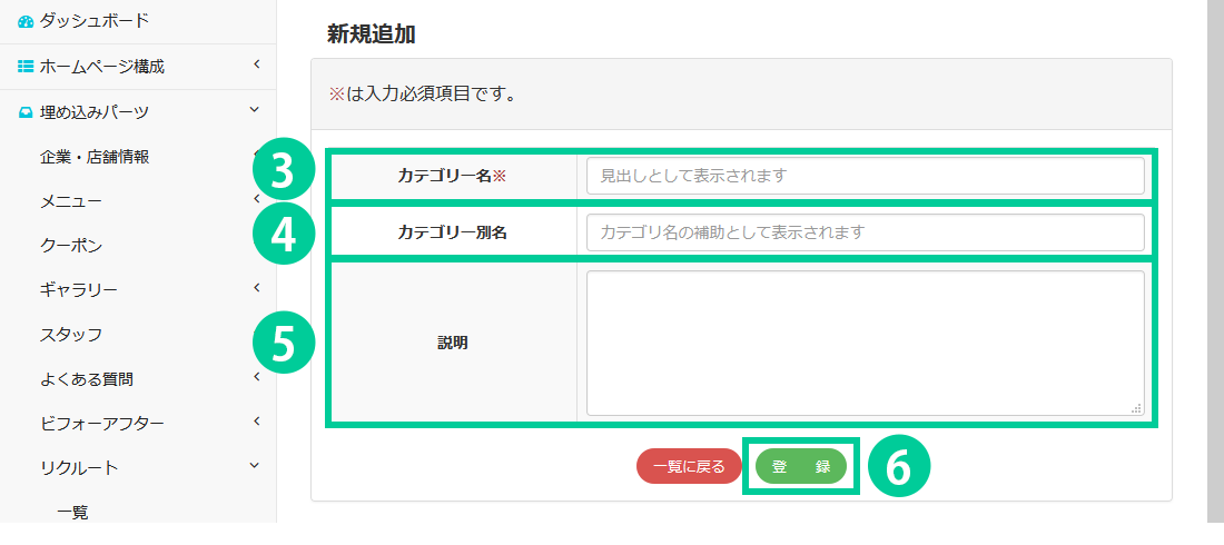4.カテゴリーの別名を入力します。 カテゴリー名の下に補助要素として表示されます。 5.説明文を入力します。 6.「登録」ボタンをクリックすると内容が反映されます。