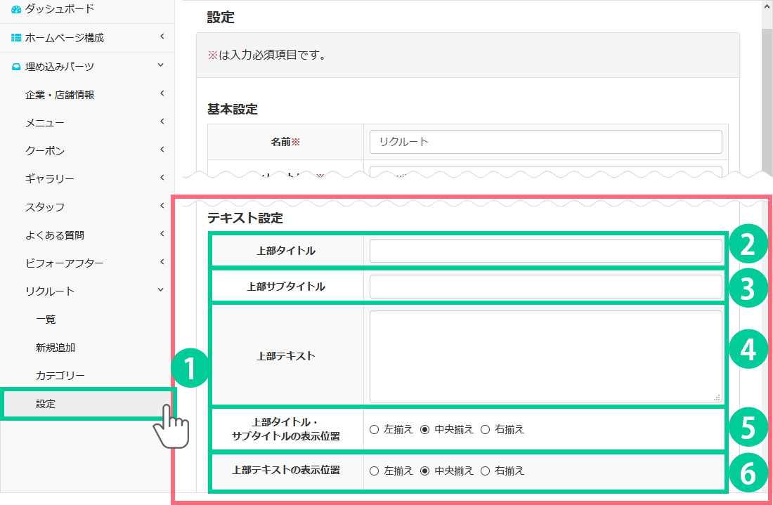基本設定の下にある「テキスト設定」の項目を入力していきます。基本設定の詳細はこちらからご確認ください。
