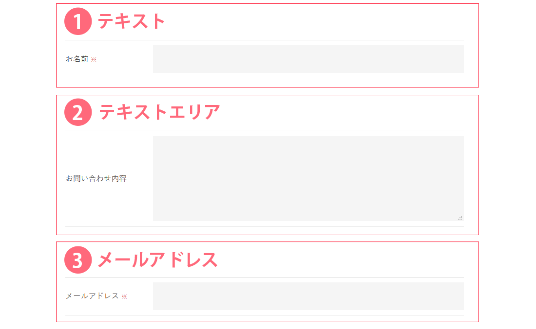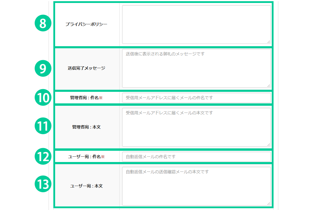 「プレースホルダとして表示する」... お問い合わせフォームのテキスト入力欄に表示されます。(入力欄がない場合は表示されません。)