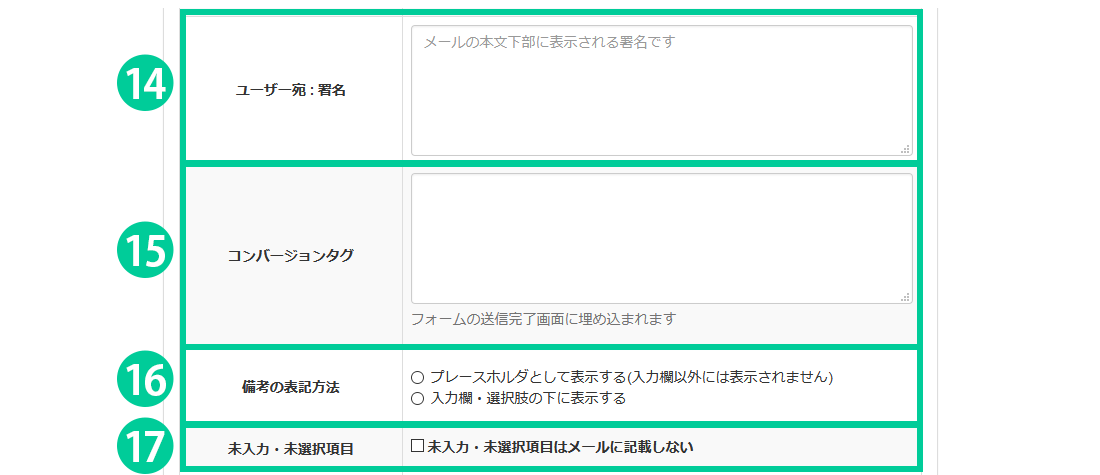 17.未入力・未選択項目をメールに記載しない場合は選択します。