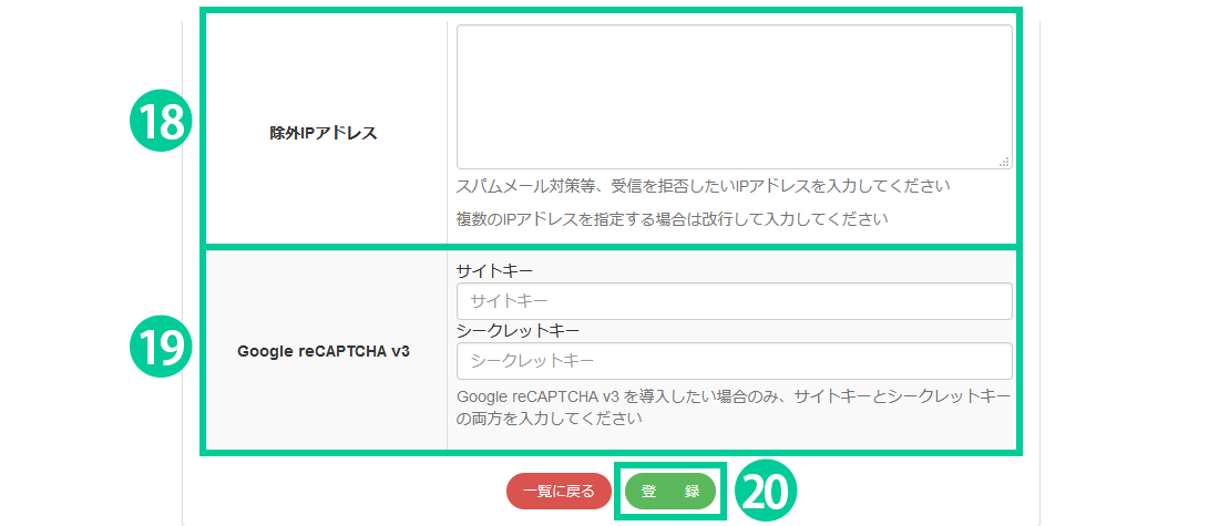 19.Google reCAPTCHA v3を導入する場合は、サイトキーとシークレットキーを入力してください。