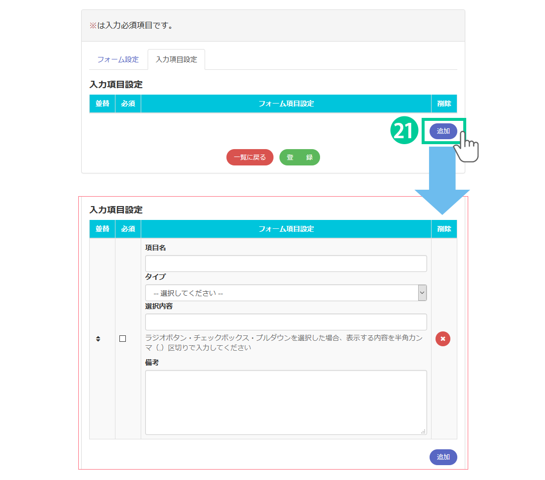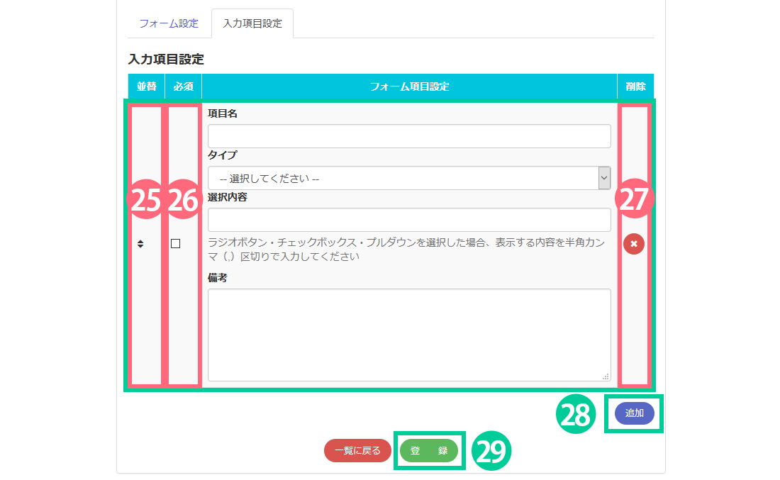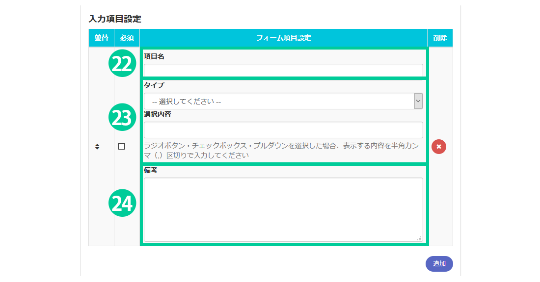※タイプで「ラジオボタン、チェックボックス、プルダウン」を選択した場合は、その下の選択内容を入力する必要があります。半角カンマ(,)で区切って入力してください。詳細は下記でご説明しています。