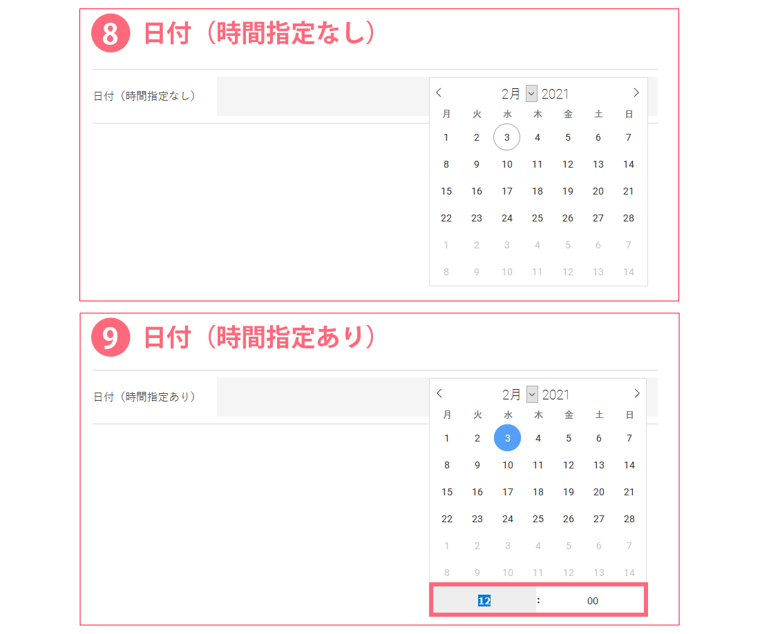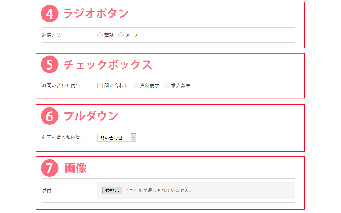 「入力欄・選択肢の下に表示する」... お問い合わせフォームの入力欄、選択項目(ラジオボタン、チェックボックス、プルダウン)の下に表示されます。