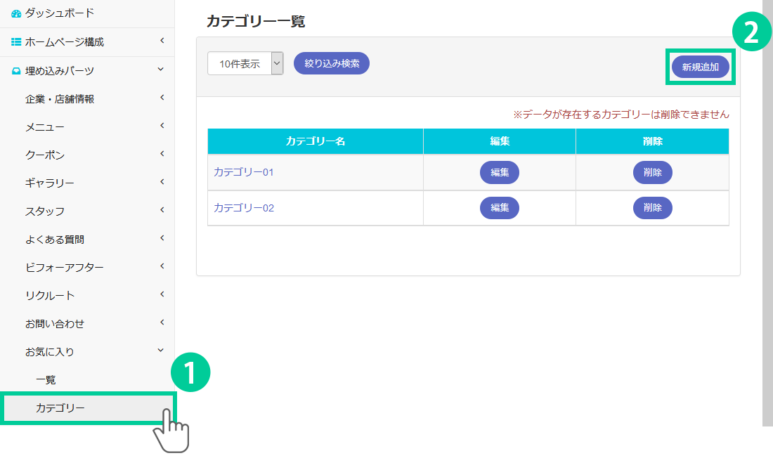 1.管理画面の左側にあるメニューから「埋め込みパーツ> お気に入り> カテゴリー」をクリックします。 2.「新規追加」ボタンをクリックします。