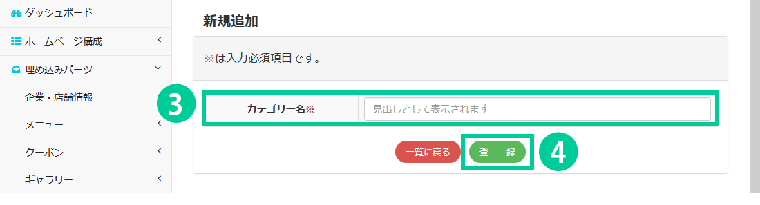 3.【必須項目】カテゴリー名を入力します。 4.「登録」ボタンをクリックすると内容が反映されます。