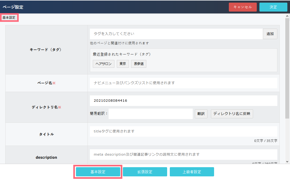 ページ名やURL、メタ情報などページの基本情報を入力します。