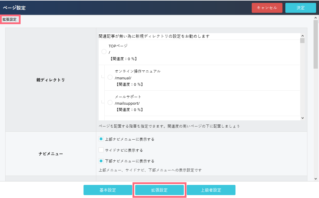 親ディレクトリの選択、ナビメニューへの表示などを拡張設定で登録します。