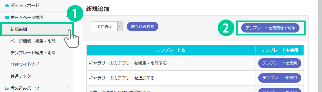 1.管理画面の左側にあるメニューから「ホームページ構成> 新規追加」をクリックします。