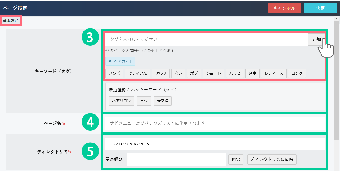 3.「タグ」設定を行います。タグ名を入力して追加ボタンをクリックすると、その下に画像のように「×ヘアカット」と表示されます。