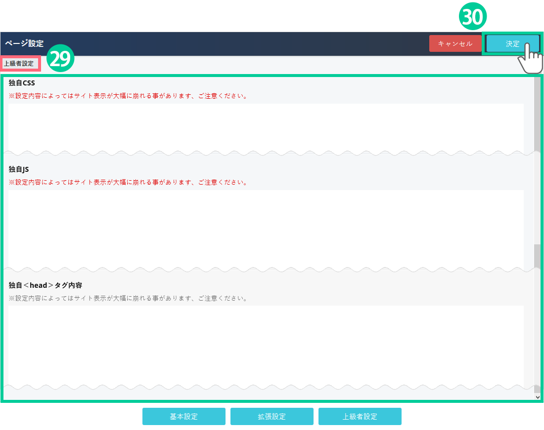 ページ制作は大きく分けて「基本設定」での作業、「拡張設定」での作業、「上級者設定」での作業、最後に「公開設定」があります。