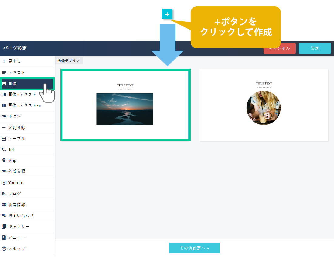 配置したいページの編集画面を開き、配置したい位置で、+ボタンをクリックして画像パーツを選択します。
