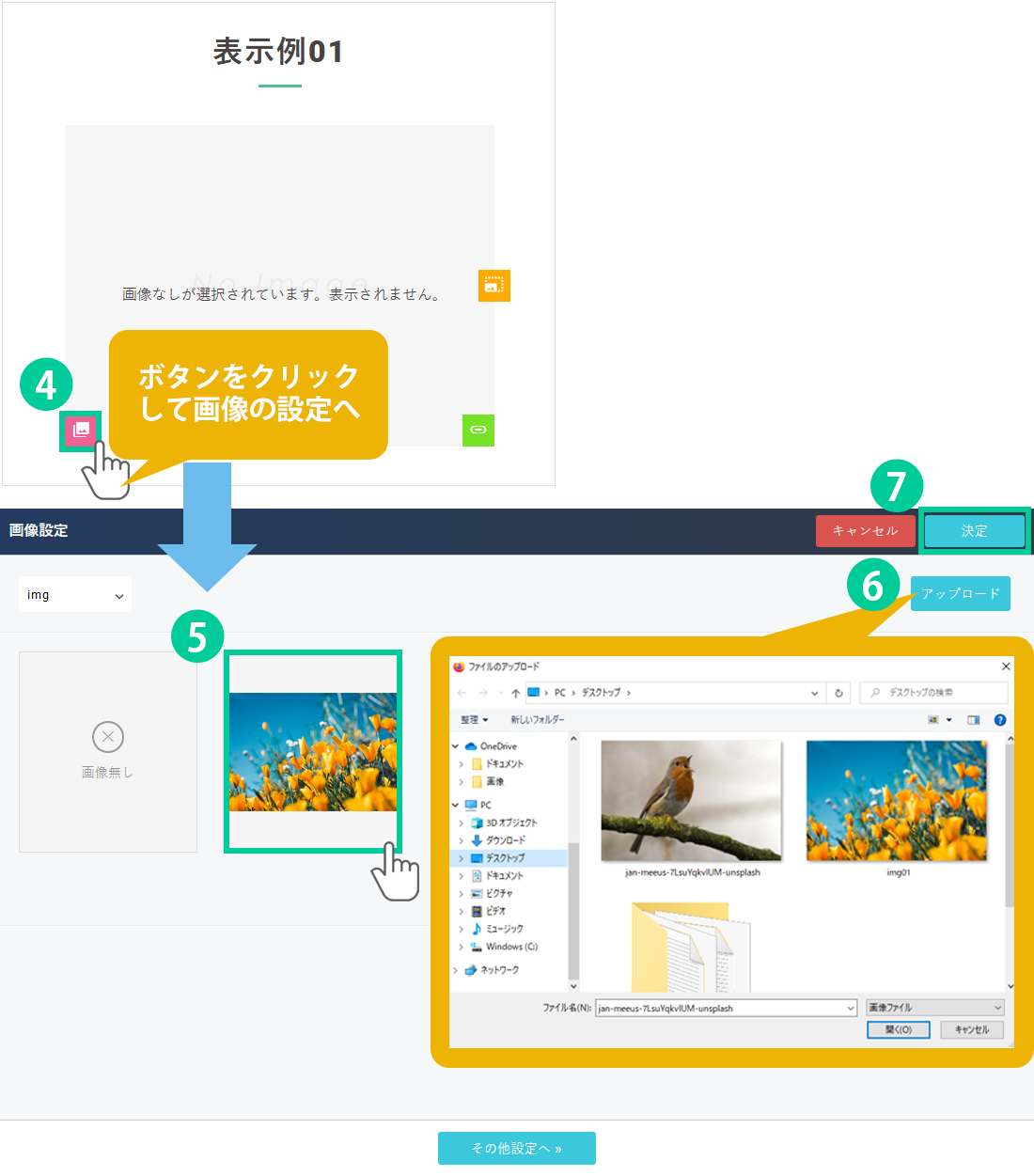 「アップロード」をクリック、画像を選択して「開く」ボタンを押すと、既に登録している画像の一覧に表示されます。後は⑤番と同様、表示させたい画像を選択します。