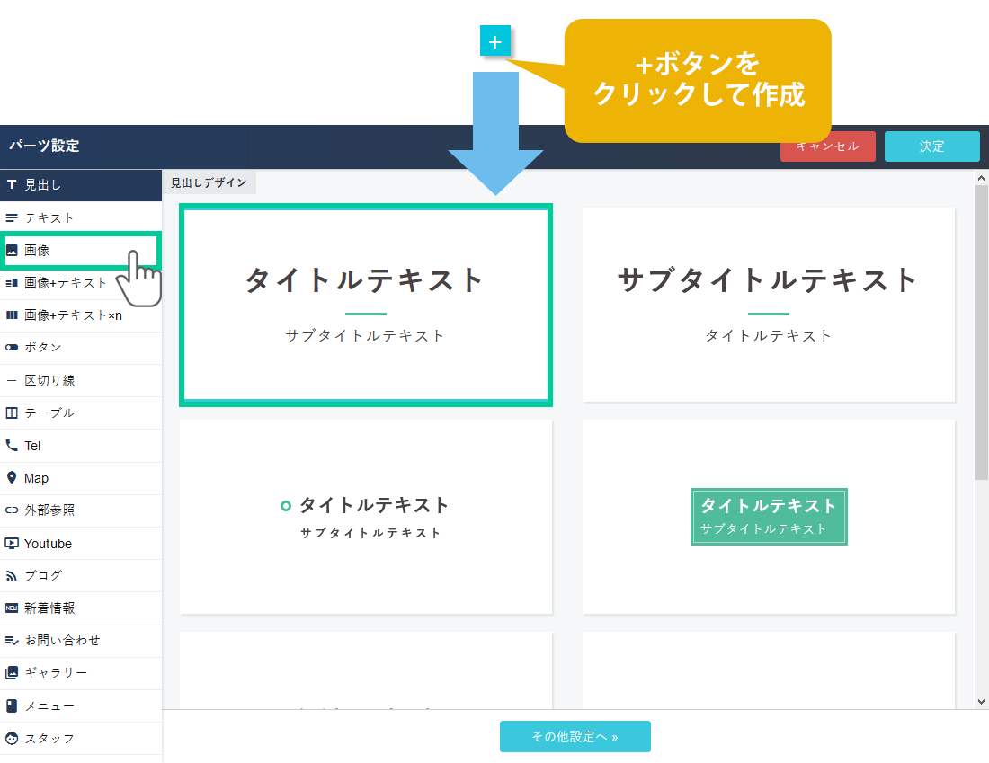 配置したいページの編集画面を開き、配置したい位置で、+ボタンをクリックして見出しパーツを選択します。