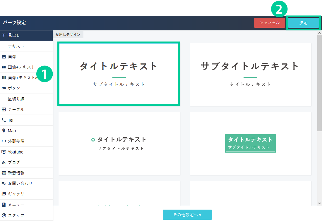 配置したパーツは上記見出しパーツのように、背景に色を入れるなど様々なデザインを設定することが出来ます。