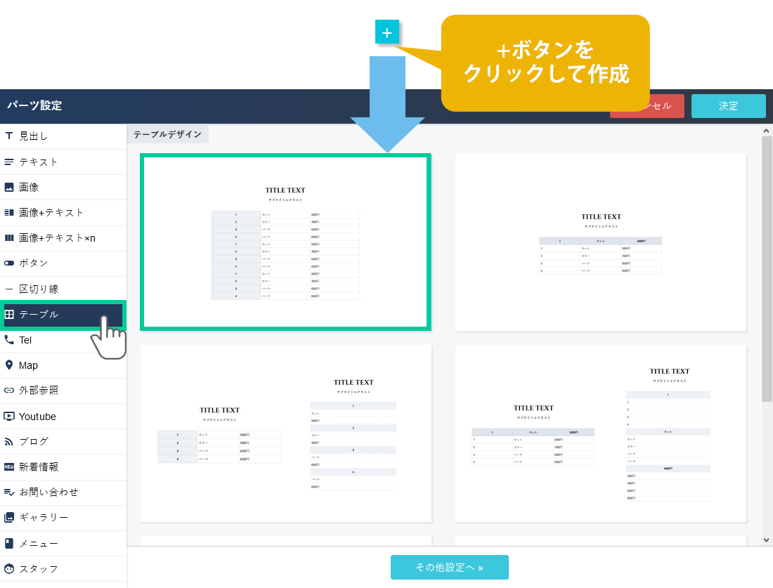 配置したいページの編集画面を開き、配置したい位置で、+ボタンをクリックしてテーブルパーツを選択します。