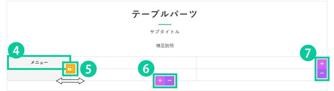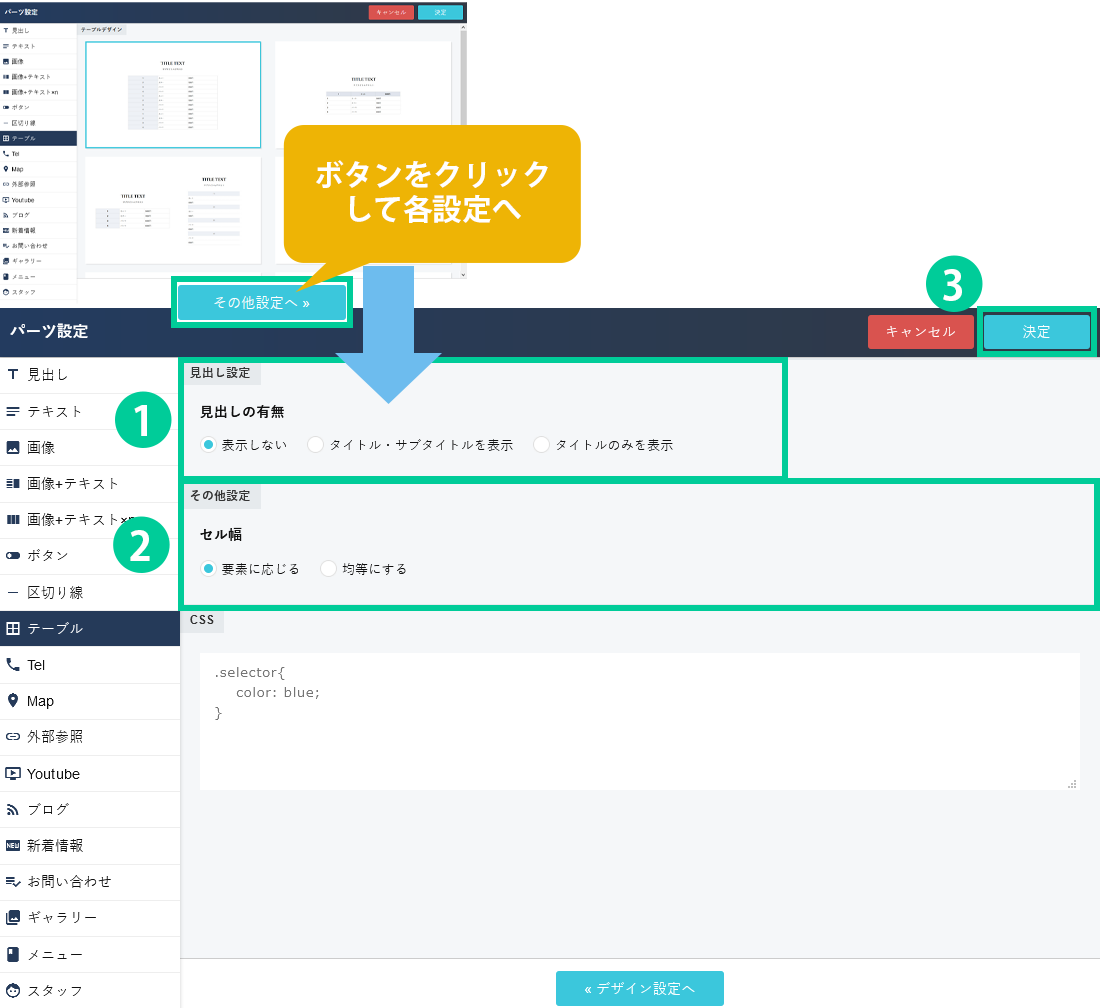 配置したパーツは上記テーブルパーツのように、背景に色を入れるなど様々なデザインを設定することが出来ます。