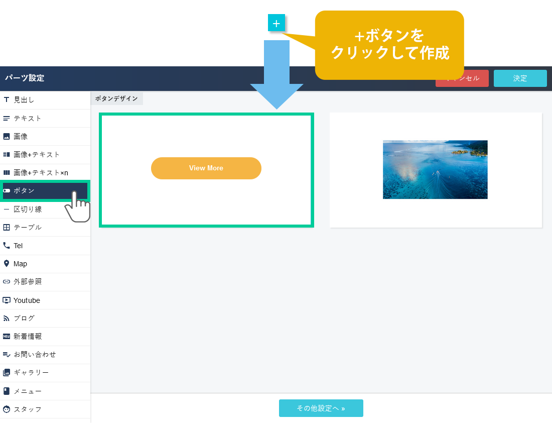 配置したいページの編集画面を開き、配置したい位置で、+ボタンをクリックしてボタンパーツを選択します。