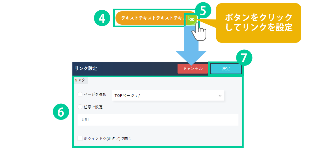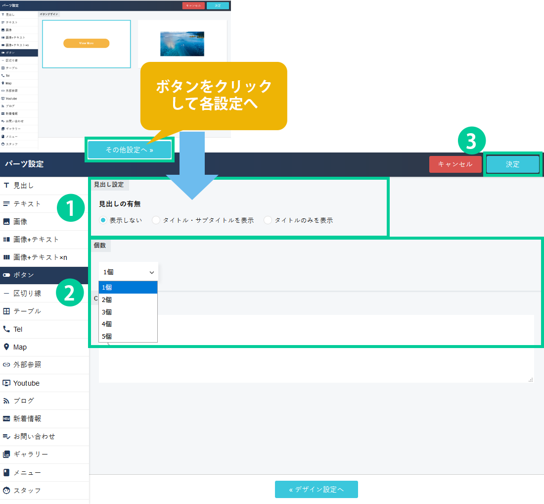 配置したパーツは上記ボタンパーツのように、背景に色を入れるなど様々なデザインを設定することが出来ます。