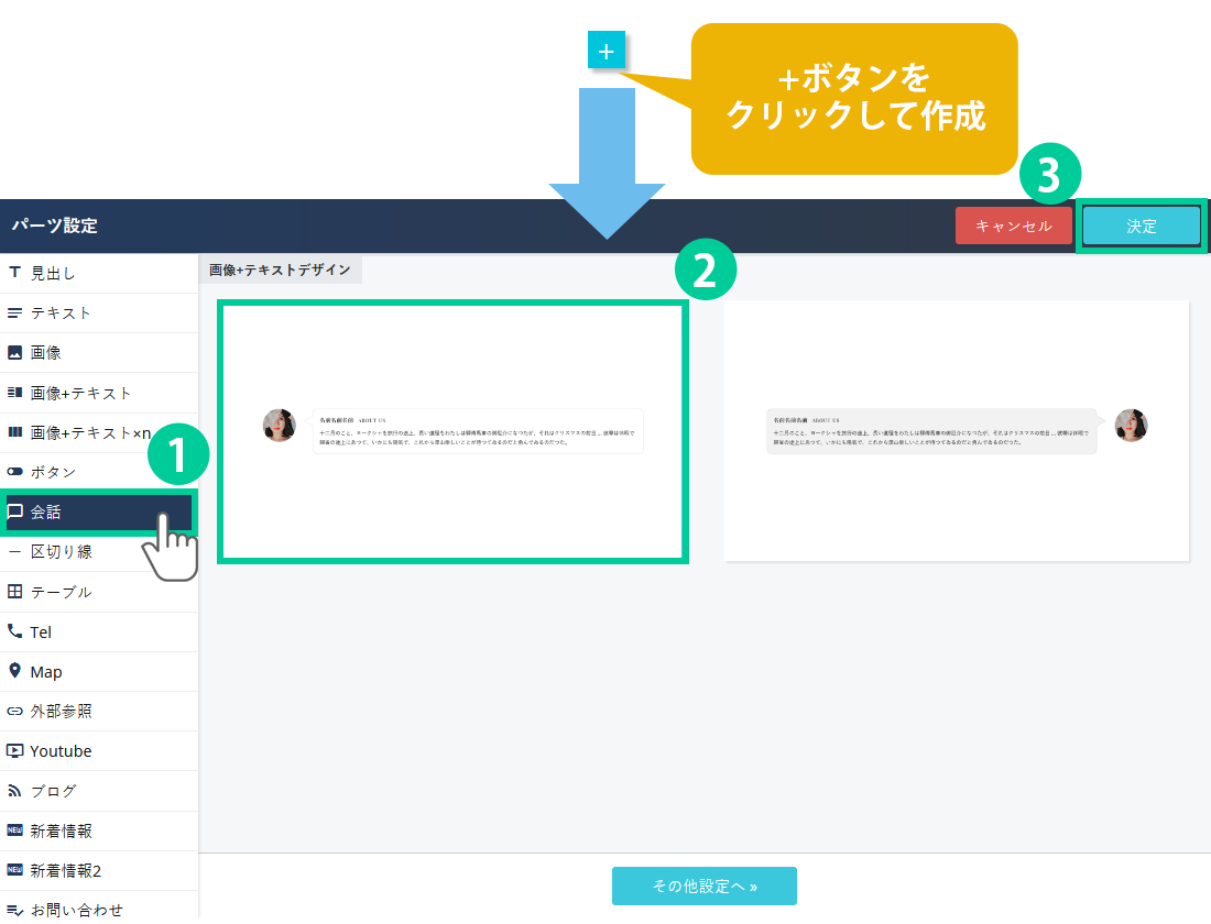 1.配置したいページの編集画面を開き、配置したい位置で、+ボタンをクリックして会話パーツを選択します。
