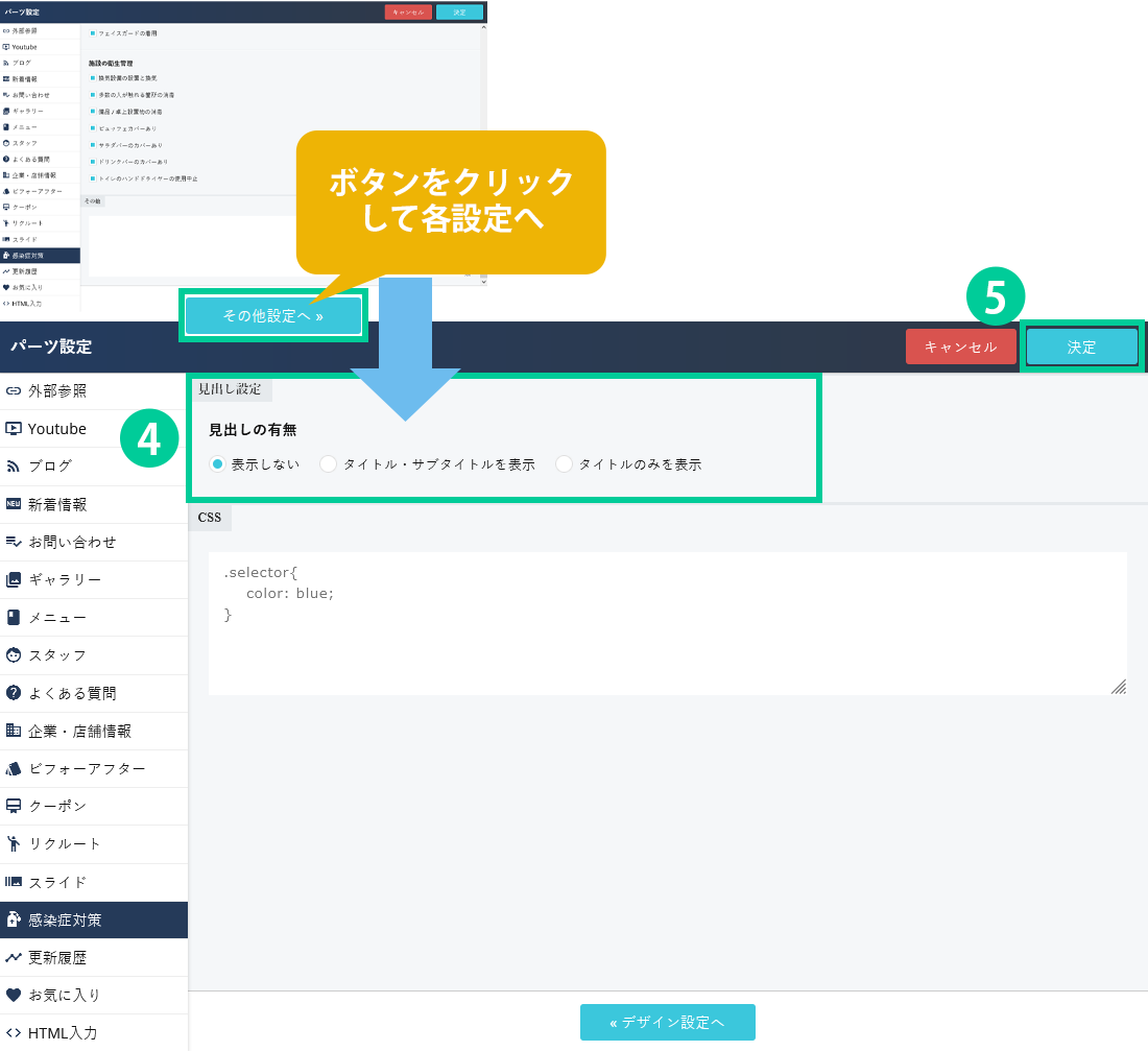 配置したパーツは上記感染症対策パーツのように、背景に色を入れるなど様々なデザインを設定することが出来ます。