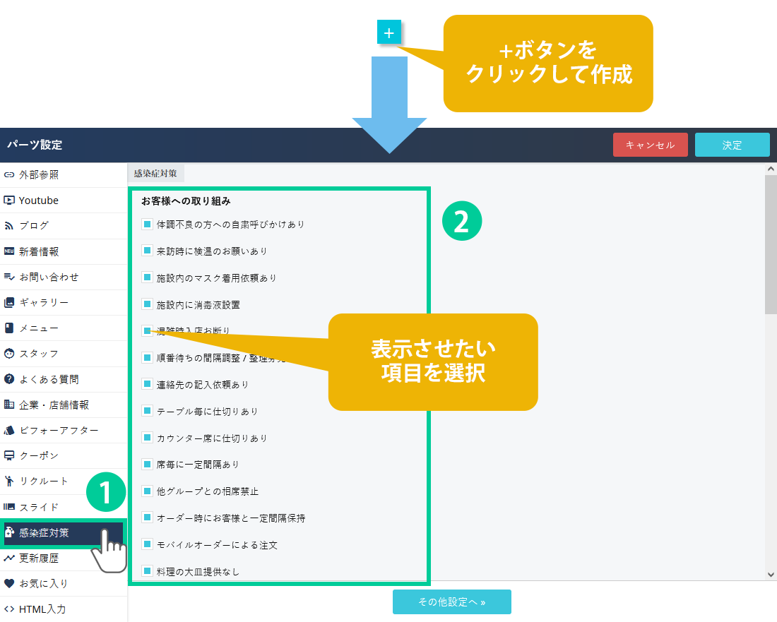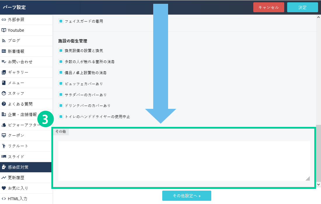 3つの項目「お客様への取り組み」「従業員の安全衛生管理」「施設の衛生管理」から、設定されている内容を選択して表示することが出来ます。選択されていない項目は表示されません。「その他」項目は任意でお好きな内容を記載することが可能です。