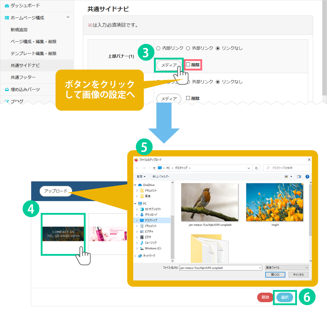 「アップロード」をクリック、画像を選択して「開く」ボタンを押すと、既に登録している画像の一覧に表示されます。後は④番と同様、表示させたい画像を選択します。