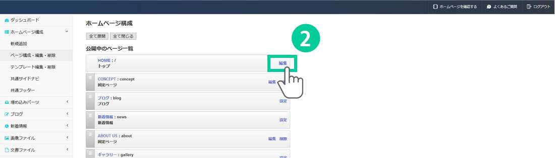 1. 管理画面の左側にあるメニューから「ホームページ構成> ページ構成・編集・削除」をクリックします。