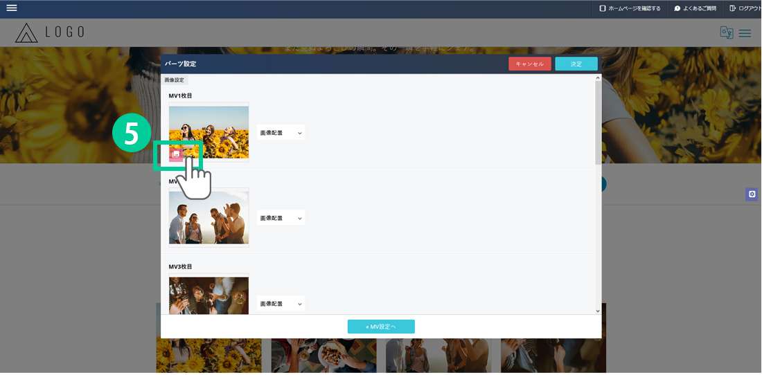 5. 変更したい画像の上にカーソルをのせると出てくるボタンをクリックします。 *画像は7枚まで設定できます。 *推奨画像サイズは1000px~1280pxです。