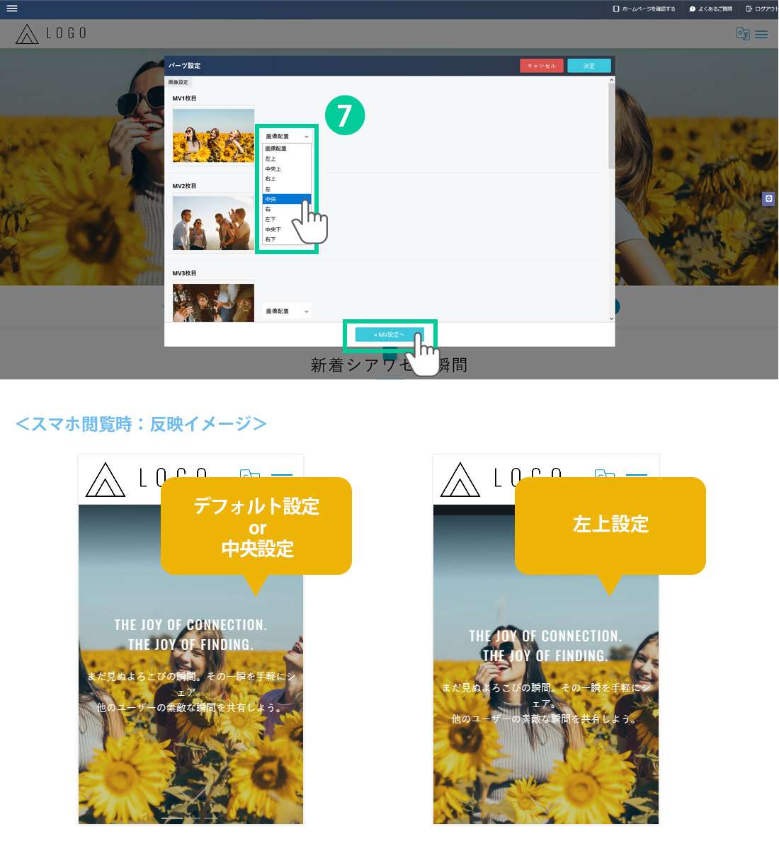 7.スマホ閲覧時に画像のアイキャッチ部分が見切れないように画像の基準点を設定することができます。設定位置によって見え方が異なります。 設定が終わったら「MV設定へ」をクリックします。 *画像配置(デフォルト)状態では「中央」設定と同じ表示になります。