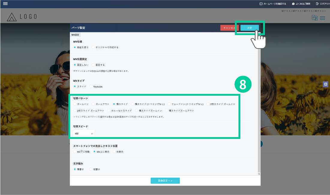 8.必要に応じて「画像の切り替えパターン」と「画像の切り替えスピード」の選択を変更します。