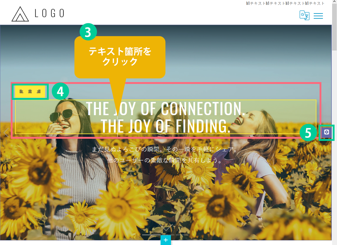 3.「テキスト変更」… テキストエリアをクリックすると、文字が直接入力出来ます。 その下にある小見出しの設定方法も同様です。 4.「テキストの位置配置」… 左揃え・中央揃え・右揃えのアイコンをクリックして選択します。 その下にある小見出しの設定方法も同様です。 5.右側にある「パーツ設定」のアイコンをクリックします。
