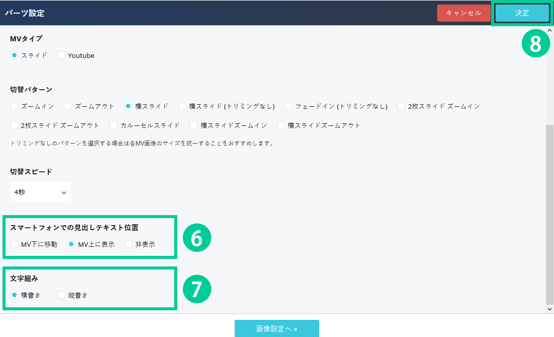 「パーツ設定」の画面が開きます。下にスクロールしてテキスト関連の設定を行います。 6.「スマートフォンでの見出しテキスト位置」… 小見出しは、スマホ時の表示方法を選択することが出来ます。 ※MVは今回の説明でいう「スライド画像」のことを指します。 7.「文字組み」… テキストを横書きにするか縦書きにするかを選択します。 8.「決定」ボタンをクリックします。