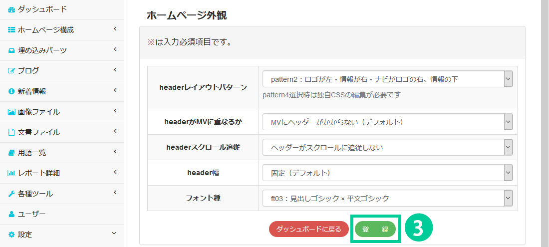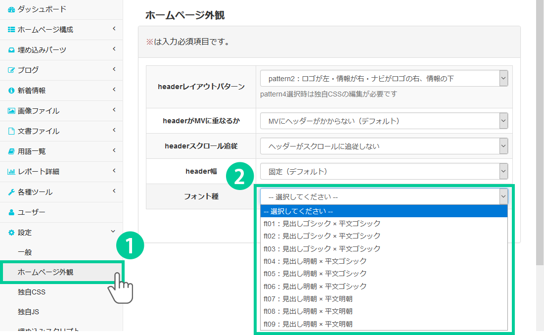 1.管理画面の左側にあるメニューから「設定>ホームページ外観」をクリックします。 2.フォントを選択します。全部で9種類あります。