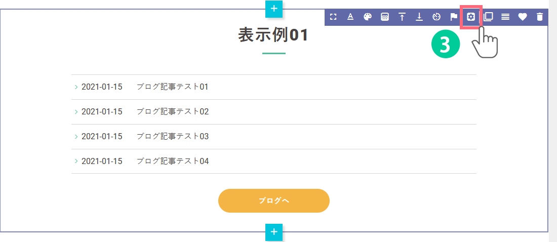 3.デザインを変更したいブログパーツもしくは新着情報パーツの上にカーソルを合わせると、パーツの右上にアイコン一覧が表示されます。
