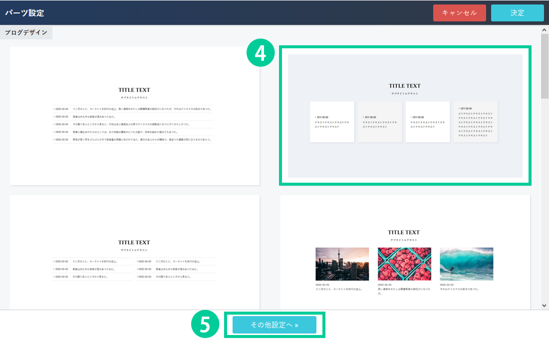「パーツ設定」の画面が開きます。 4.変更したいデザインを選択します。 5.「その他設定へ」ボタンをクリックします。