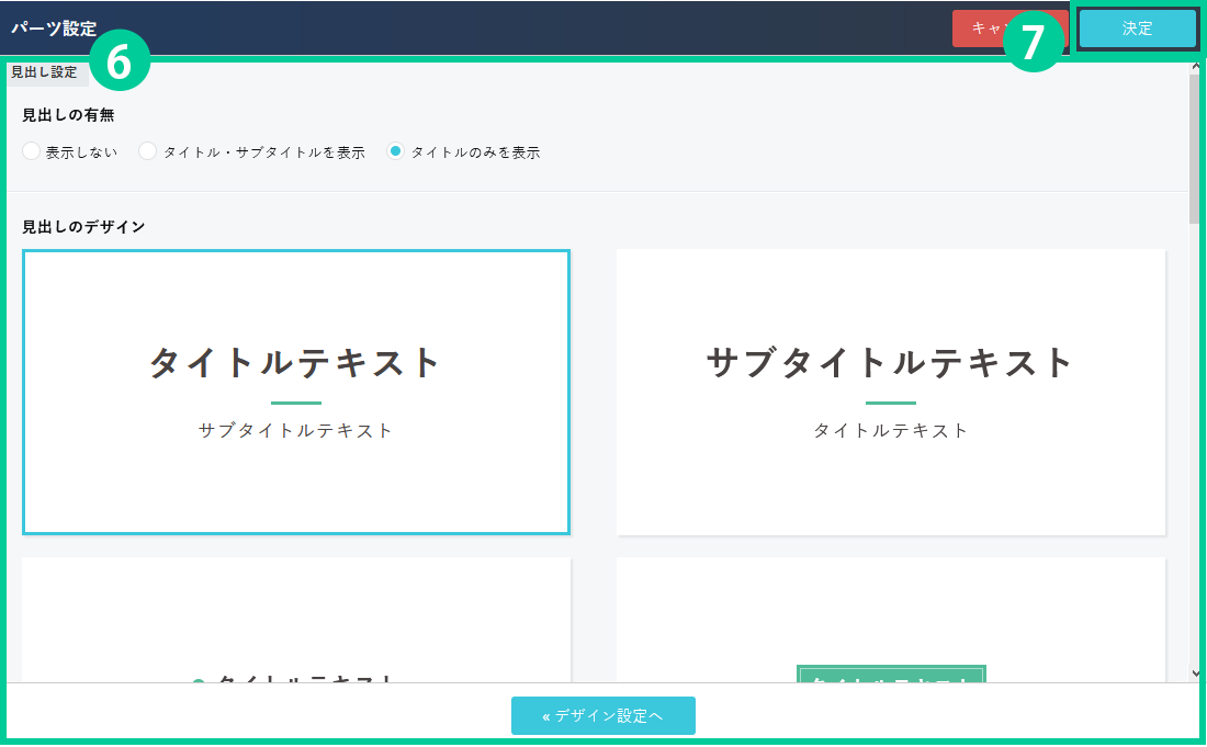 6.必要に応じて見出しのデザインや、表示件数も変更することが出来ます。 7.「決定」ボタンを押すとデザインが変更されます。 「キャンセル」ボタンを押すと設定した内容が破棄されます。